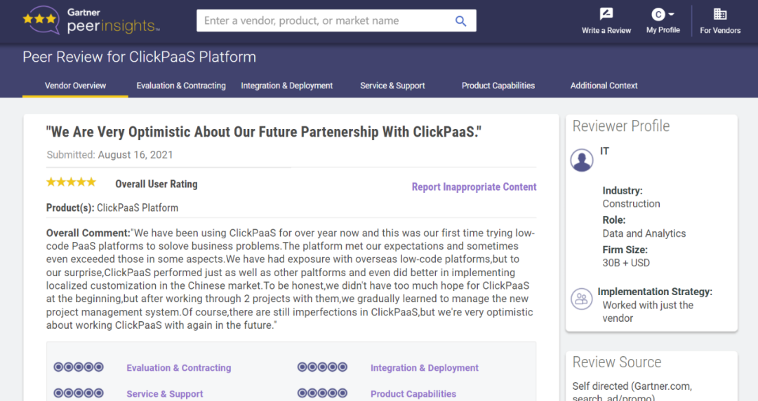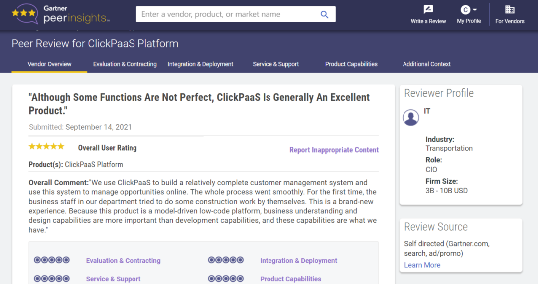 Tips::::::【Peer Insights】——用户对企业IT产品和服务发布真实评价的平台。。。。。。。。。。。。目前已有355个市场,,,,,,,255,000条经过验证的评价。。。。。。每一条评价Gartner会针对参评企业营收规模及参评人员信息做验证、、、、、、、、、评价内容做多维核实。。。。。